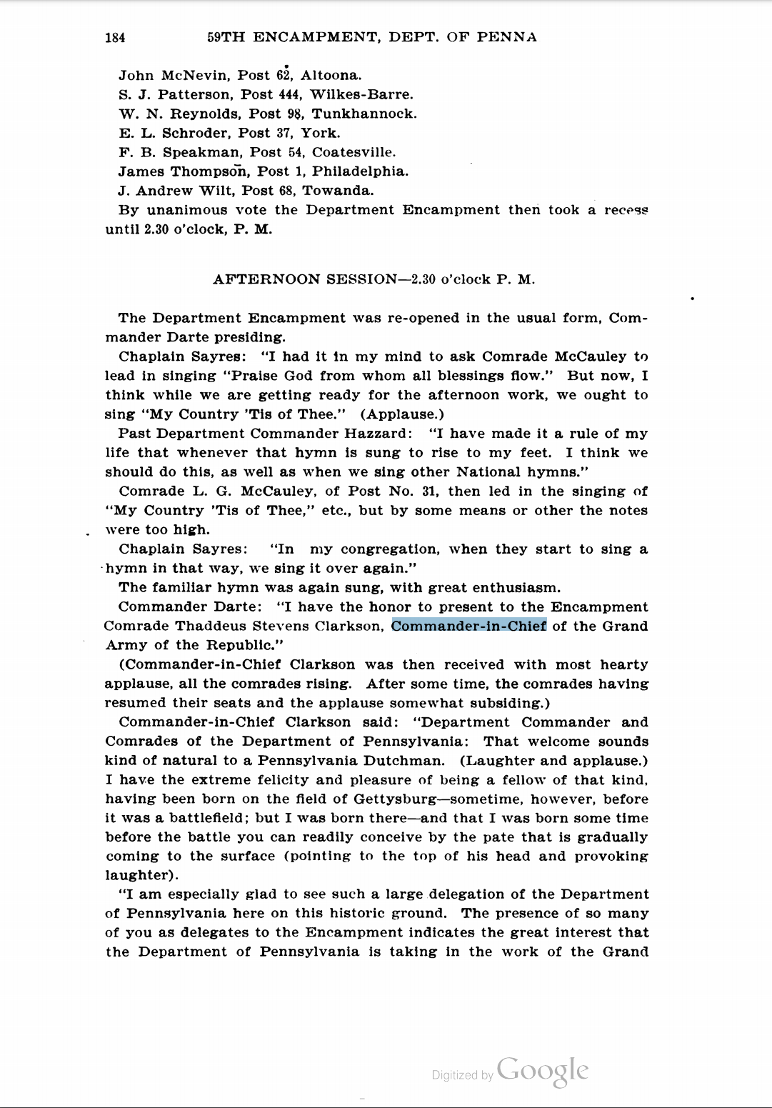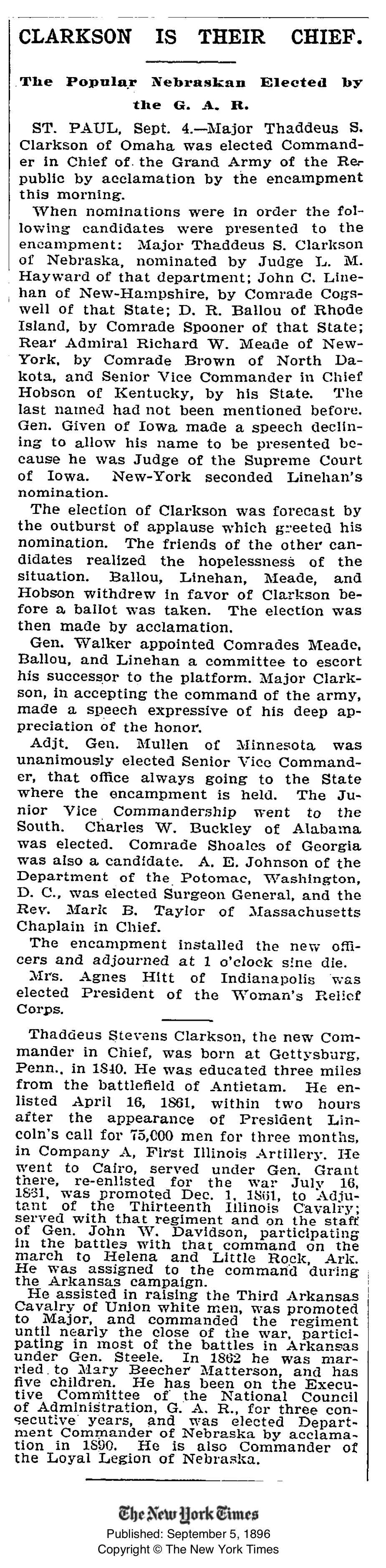 Thaddeus Stevens Clarkson (April 26, 1840 – January 16, 1915) was an American soldier who served in the Union Army during the American Civil War and as the 25th Commander-in-Chief of the Grand Army of the Republic, 1896-1897.