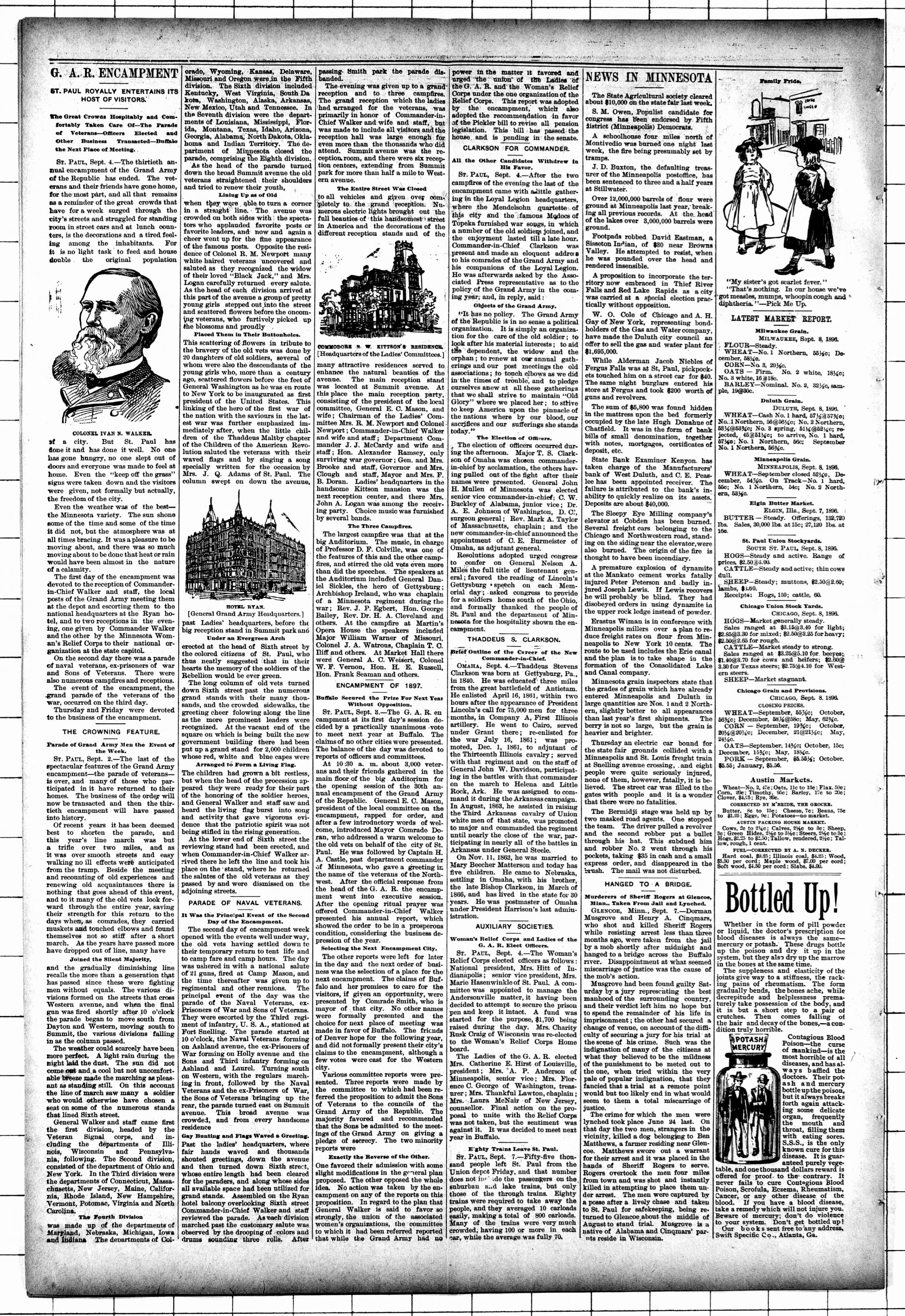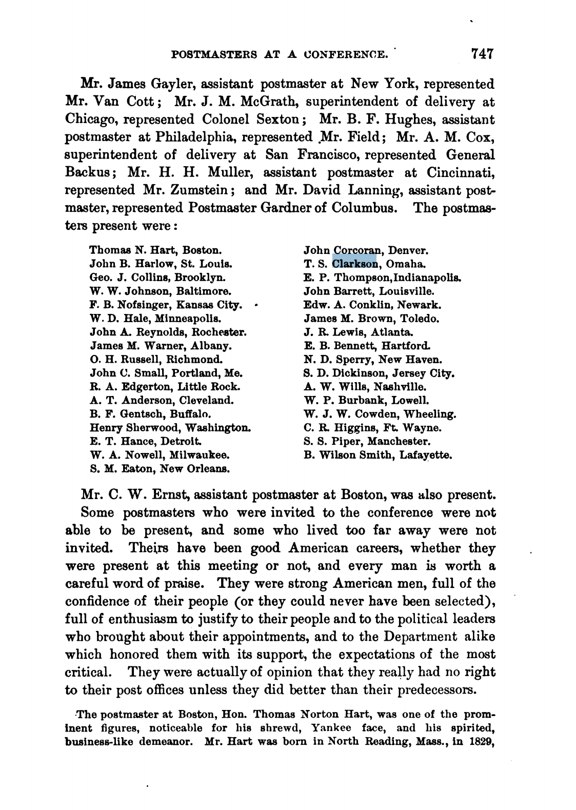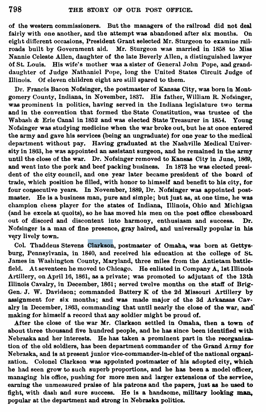 In March 1866 Clarkson settled in Nebraska with his family and became postmaster in Omaha. He became active with the G.A.R., serving as Commander of the Department of Nebraska in 1890, Junior Vice Commander-in-Chief of the G.A.R. in 1892, and finally as Commander-in-Chief of the G.A.R., 1896-1897. He was elected May 23, 1898 as general manager of the Trans-Mississippi International Exposition.