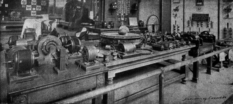 Figure 297 (see article photo) shows a view of part of the exhibits containing the motor apparatus. Among these is shown at A a large ring intended to exhibit the phenomena of the rotating magnetic field. The field produced was very powerful and exhibited striking effects, revolving copper balls and eggs and bodies of various shapes at considerable distances and great speeds. This ring was wound for two-phase circuits, and the winding was so distributed that a practically uniform field was obtained. This ring was prepared for Mr. Tesla’s exhibit by Mr. C.F. Scott, electrician of the Westinghouse Electric and Manufacturing Company.[2]