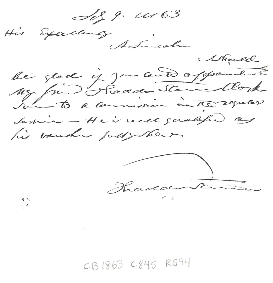 I should be glad if you could [appointment] my friend Thaddeus Stevens Clarkson to a commission in the regular service — He is well qualified as his vouchers fully show.