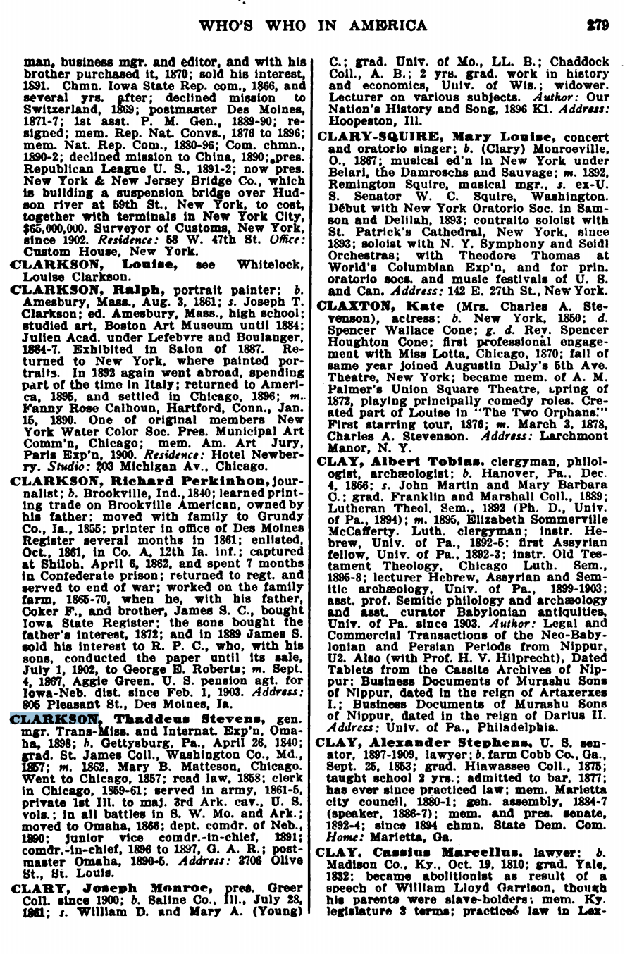 Clarkson died January 16, 1915 in Newberg, Oregon. He is buried in Omaha at Prospect Hill Cemetery, where his headstone is missing.